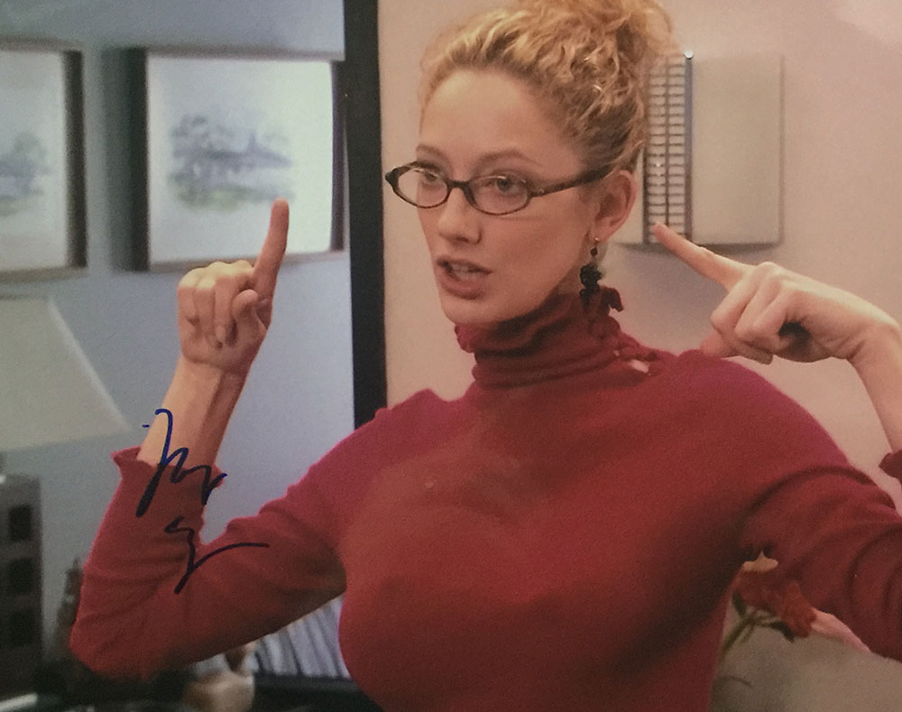 I acquired this hilarious 8×10 of Judy Greer in “Arrested Development” (she’s telling Jason Bateman’s character that her eyes are “up here” after he had been caught wondering why her nipples were horribly off after a boob job) via Autograph World in 2014.