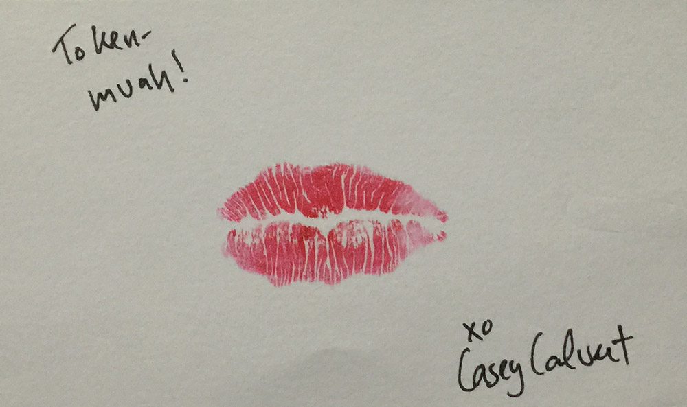 Adult film star Casey Calvert signed these two 8x10s and one index card (which she also kissed!) for me through the mail.